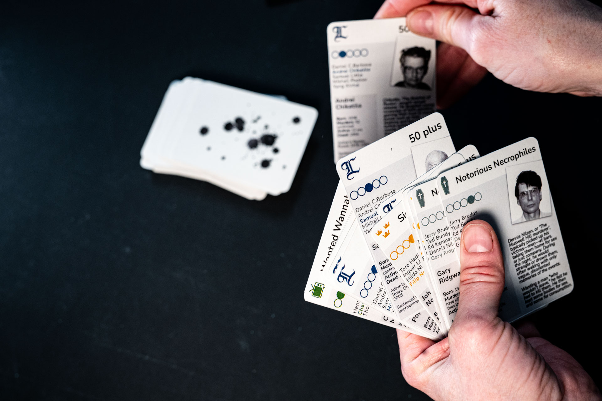 In this dark-humor indie card game, players collect quirky, stylized cards based on infamous killers to complete themed groups. On your turn, ask other players for cards you need; if you succeed, keep going, and if not, draw and pass. Keep asking as long as you succeed, lay down finished sets for points, and when all groups are claimed, the highest score wins—ties decided by Jack the Ripper.