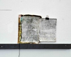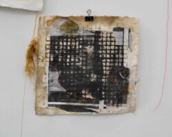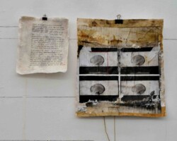 The installation is realized through mixed media, including photography, cotton thread, canvas, paper collage, and an abundance of text.