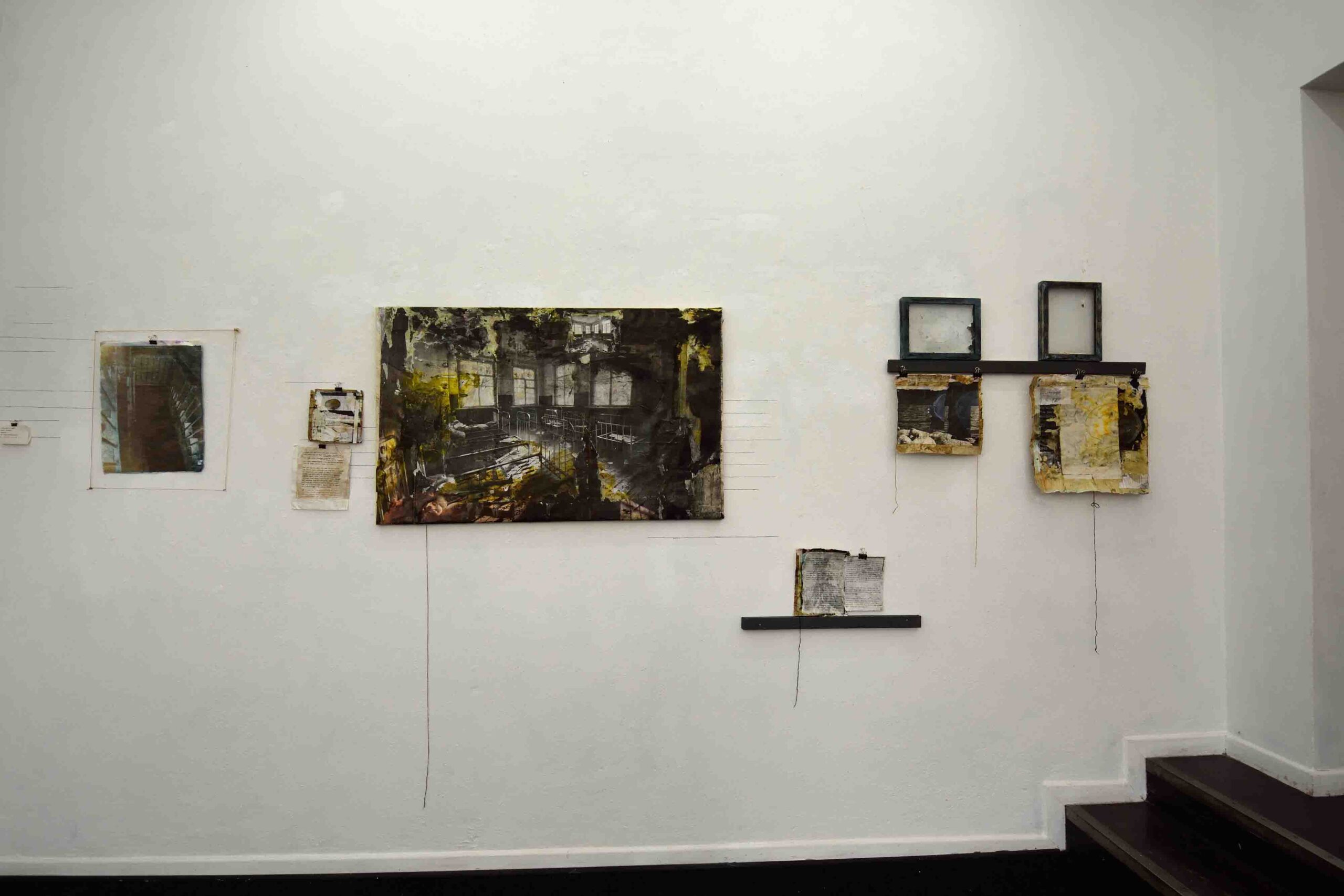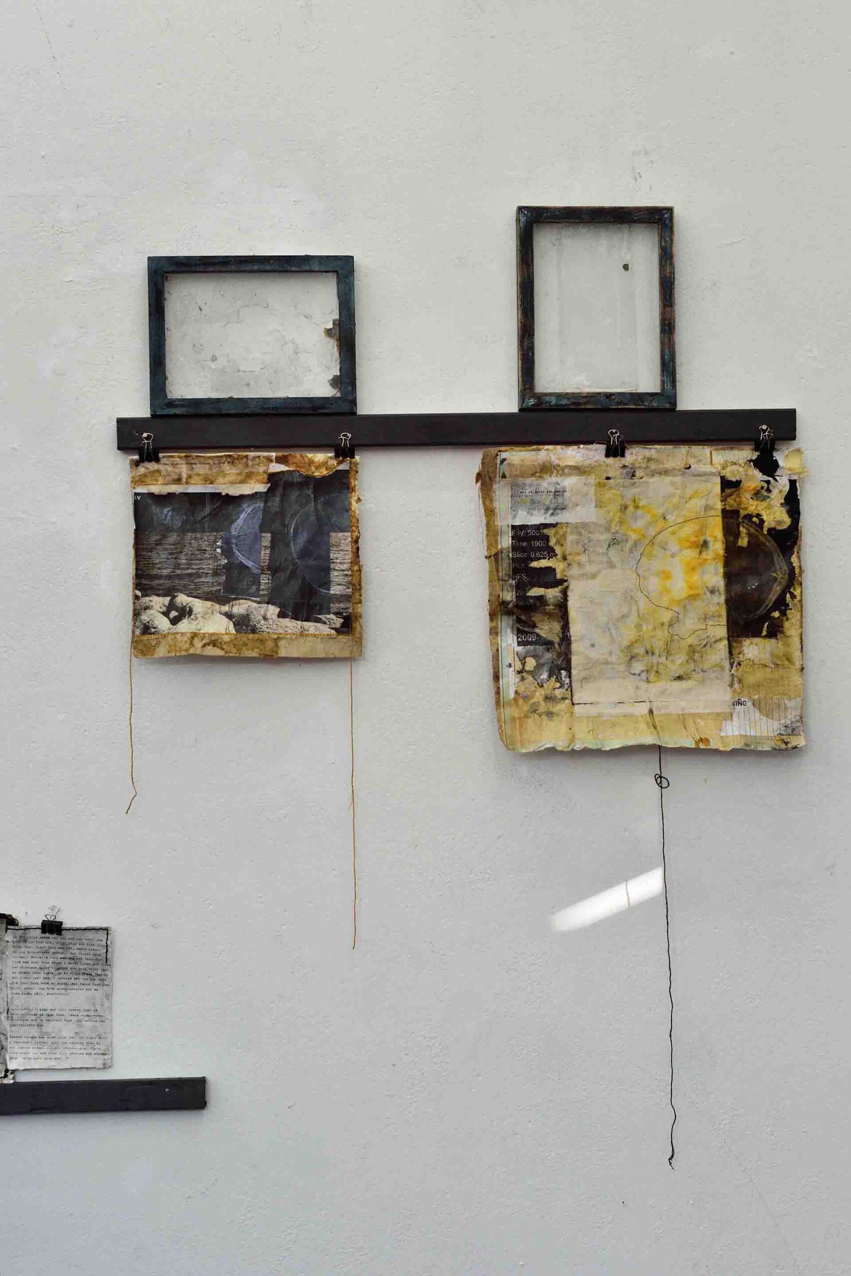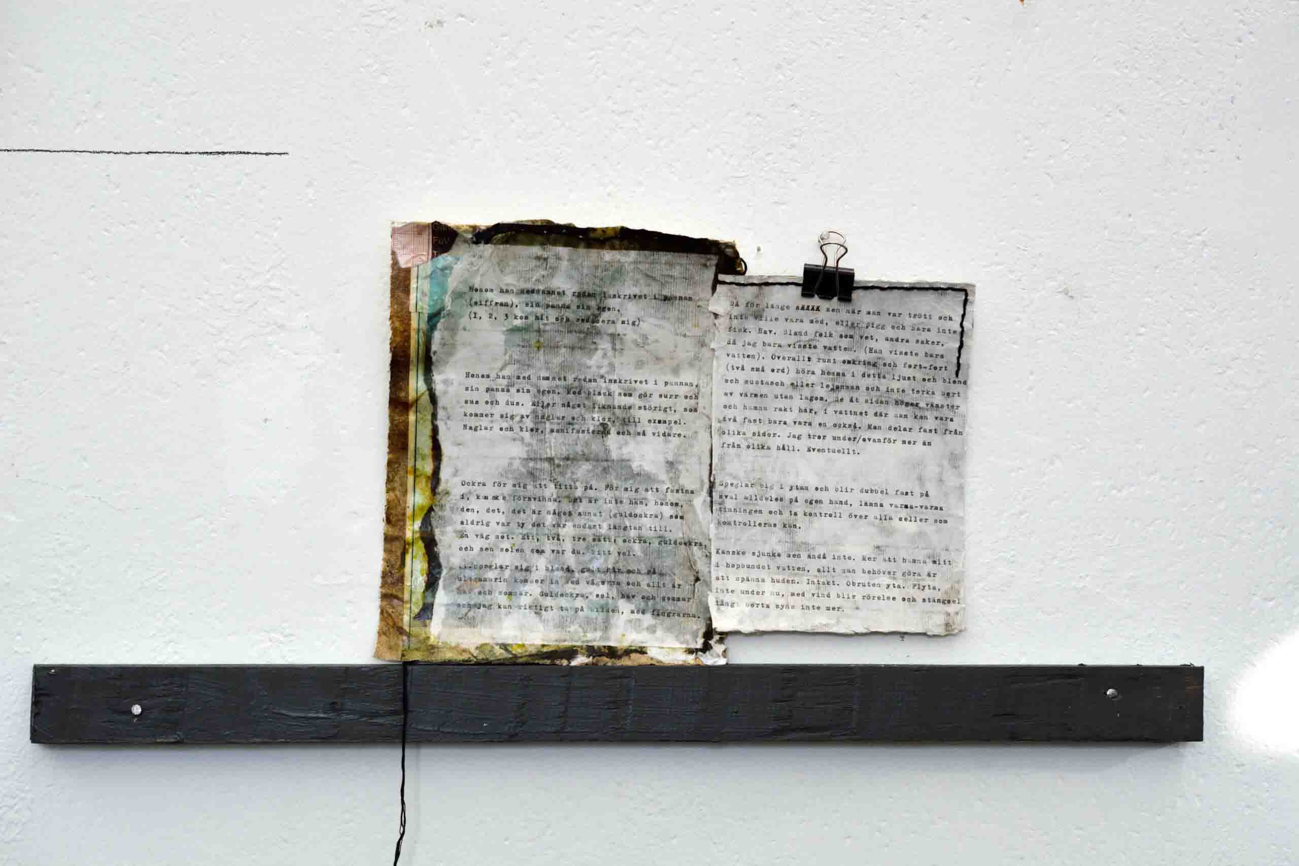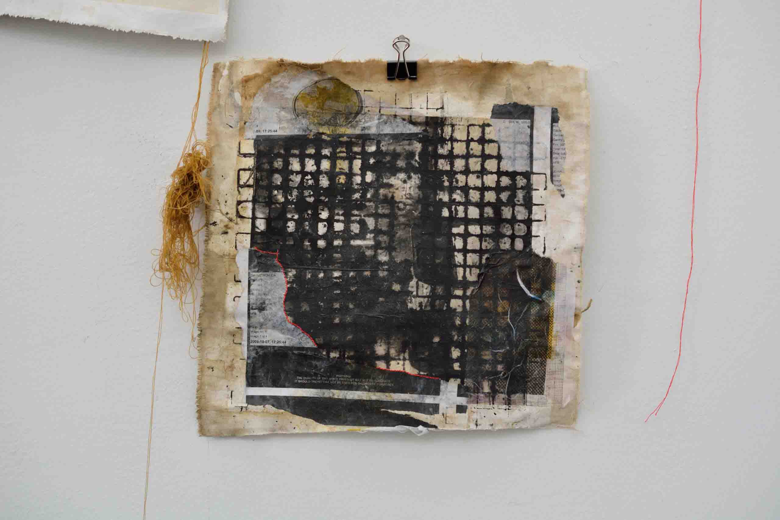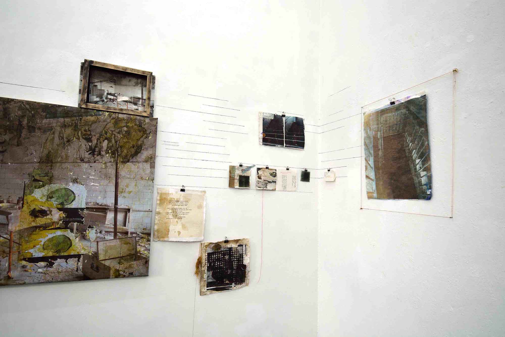 The installation is realized through mixed media, including photography, cotton thread, canvas, paper collage, and an abundance of text.