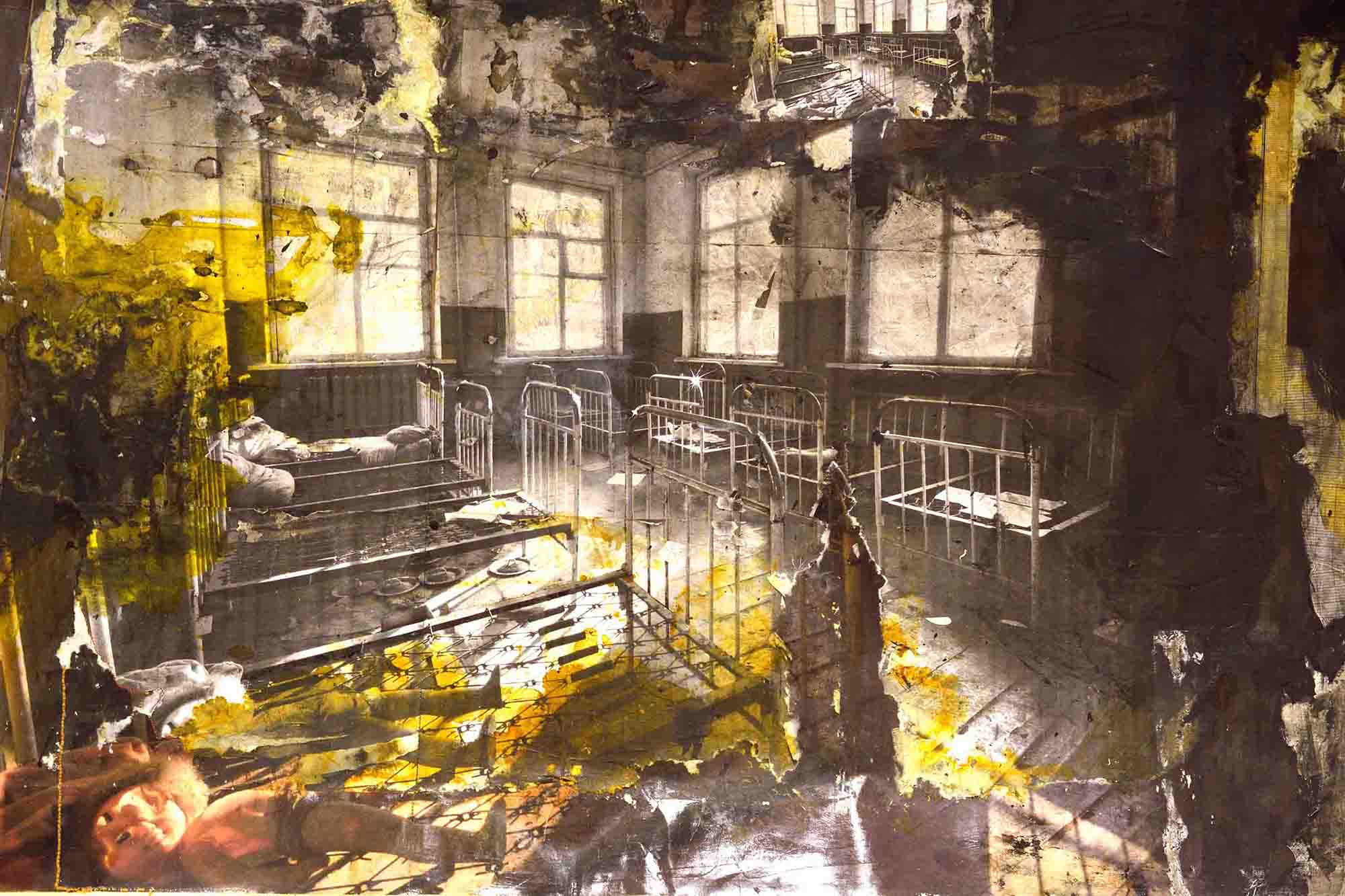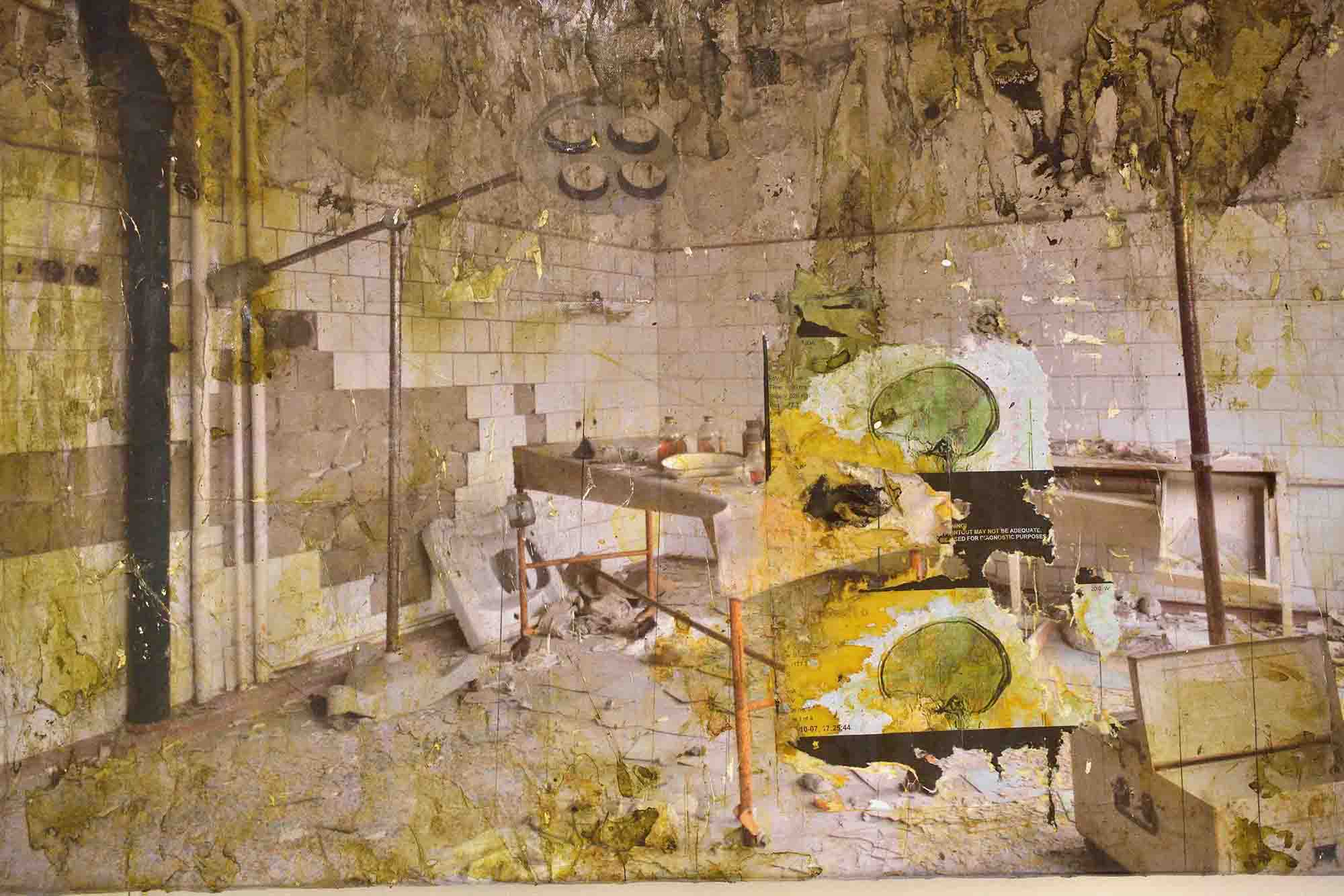 The work incorporates images of a brain scan from Frihetsorganismen, alongside collages composed of photographs from the hospital in Pripyat—the town built for the Chernobyl nuclear plant—and from an abandoned children’s home on the outskirts of Chernobyl. These materials are brought together through a process that treats the exhibition space as an active element, working in close dialogue with its architecture and atmosphere.