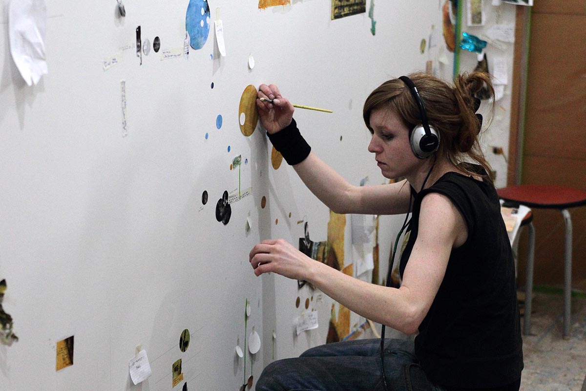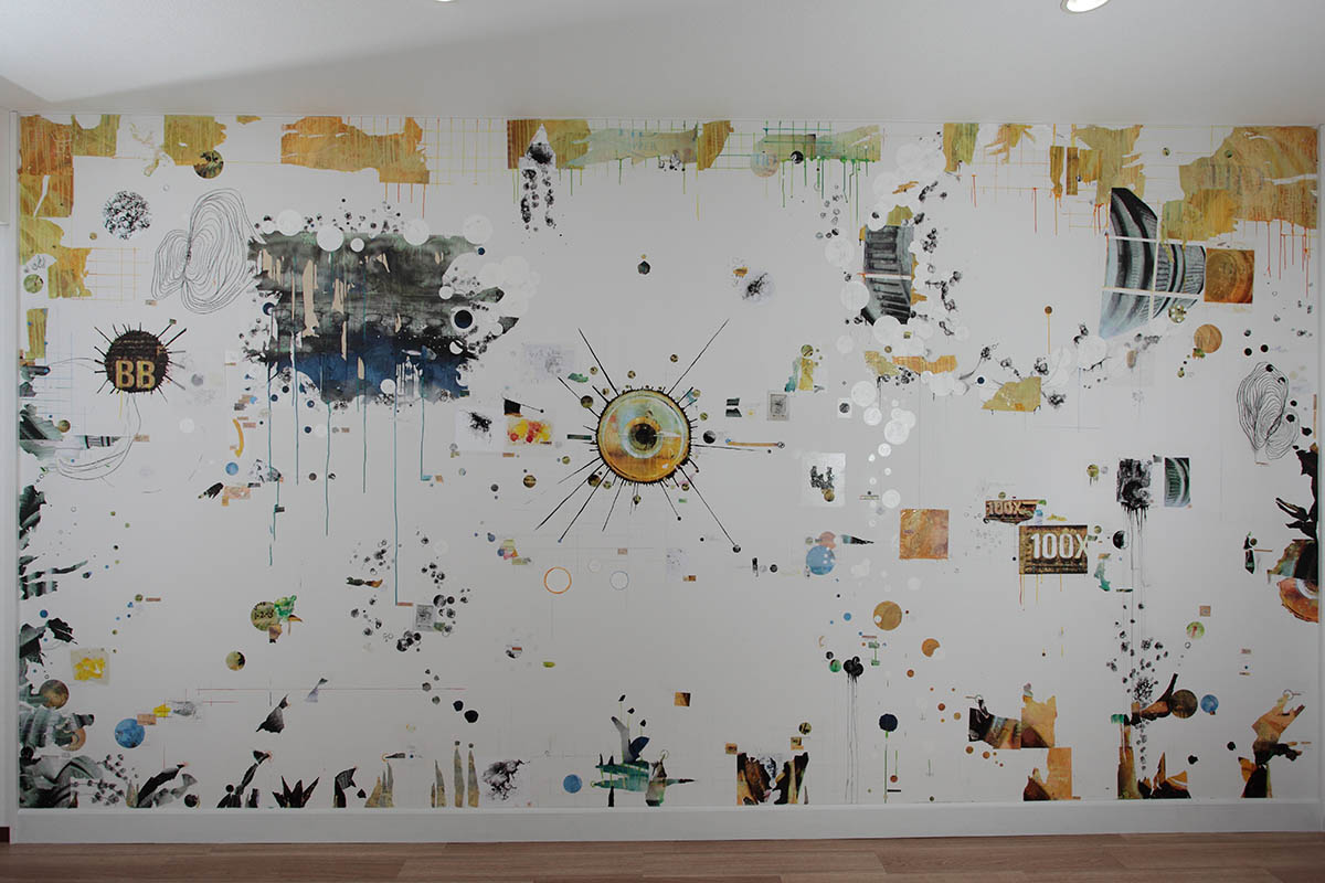 Working from photographs taken with an old analog camera, I developed a collage on site over the course of three weeks. Employees were able to take part in the process by following the work through a live camera feed.